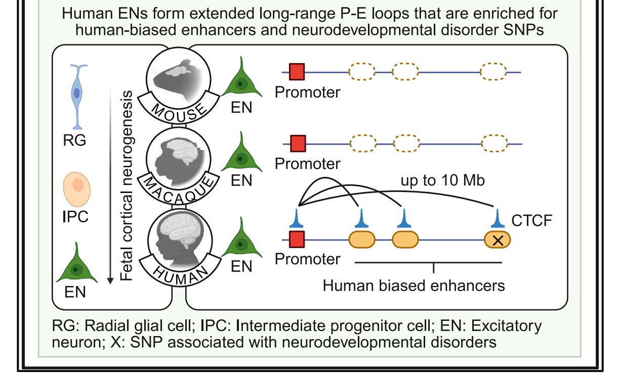研究者将SCOPE-C应用于人、猕猴和小鼠的胎脑皮层,系统绘制了神经发生过程中多种细胞类型的三维基因组互作图谱。结果显示,相较于放射状胶质细胞(RG),人类兴奋性神经元(EN,subplate层的主要细胞群)展现出更为丰富且线性距离更长的增强子–启动子(P-E)互作,最长可达10 Mb,构成了更复杂的远程调控网络;而在RG细胞中这类长程互作相对较少。进一步的比较分析表明,EN中的长程P-E互作与人类相较于猕猴和小鼠特有增强子紧密相关,提示人类皮层在进化过程中形成了更为精细的基因调控模式。这些互作的锚点区域显著富集了CTCF(CCCTC-binding factor)结合位点,支持CTCF在长程染色质互作网络的形成与维持中发挥了重要作用。与此同时,人类中特有的P-E互作网络与神经发育障碍相关的SNP高度重合,提示它们不仅参与了人类皮层发育的物种特异性调控,也可能提供理解大脑疾病易感性的关键线索。为验证互作信号在单细胞内存在,研究者利用三维荧光原位杂交(3D FISH)技术对人脑EN中的代表性长程P-E互作的空间共定位进行了验证。