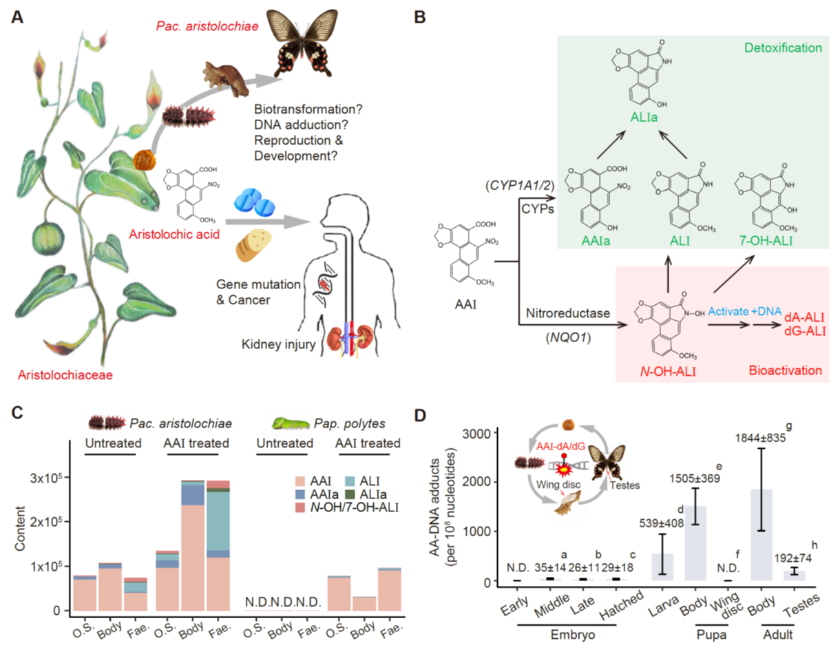 图1. 红珠凤蝶对马兜铃酸的生物转化与DNA加合物形成
