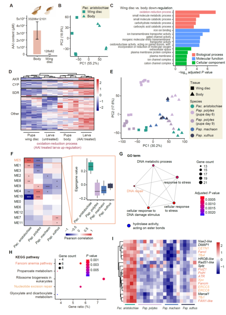 另一方面,由于红珠凤蝶身体组织中存在高浓度马兜铃酸及相应DNA加合物,研究进一步比较了该物种与多种不取食马兜铃的凤蝶科蝴蝶的基因表达谱。通过基因共表达网络分析,研究鉴定获得了一个在红珠凤蝶中特异性高表达的基因模块,其中处于网络枢纽位置的关键基因显著富集于DNA损伤修复相关通路,特别是范可尼贫血(FA)和核苷酸切除修复(NER)通路。这表明,红珠凤蝶可能通过上调DNA修复基因,应对马兜铃酸诱导的DNA损伤,从而降低突变积累的风险(图4)。