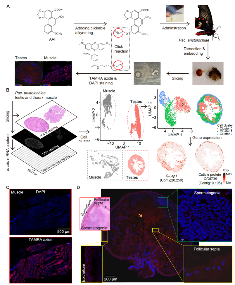 图5. 红珠凤蝶精巢马兜铃酸分布与空间基因表达模式